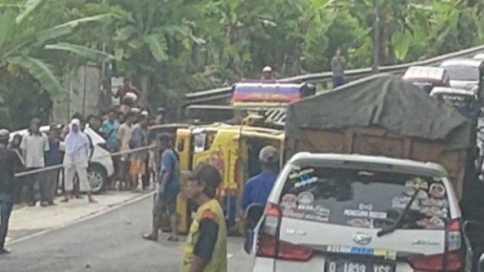 Mobil Honda Brio berplat nomor Z 1172 NV menabrak truk nopol Z 9651 bermuatan pasir di Jalan Raya Nasional Padaherang