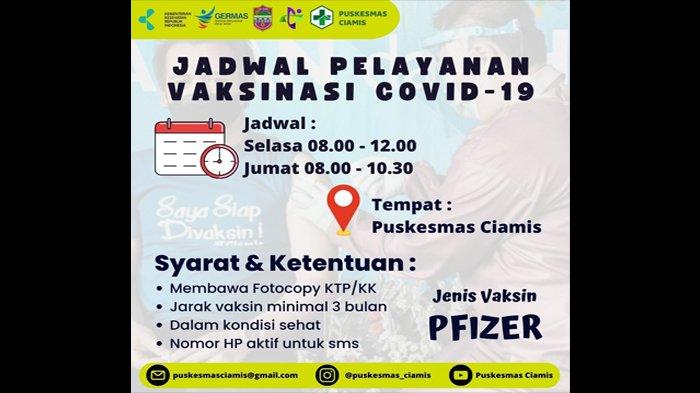 "Betul besok ada kegiatan vaksinasi di Puskesmas Ciamis, jadwalnya setiap Selasa dan Jumat, dan untuk besok jenis vaksinnya hanya Pfizer dan kuotanya cukup untuk 50 - 100 orang," kata Evie melalui pesan WhatsApp, Kamis (16/2/2023).
