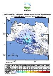 Tercatat gempa terakhir pukul 02:00:45 WIB, Magnitude 4,0. Episenter terletak pada koordinat 6.73 LS dan 106.61 BT, atau tepatnya berlokasi di darat pada jarak 25 km Barat Daya Kota Bogor pada kedalaman 5 km.