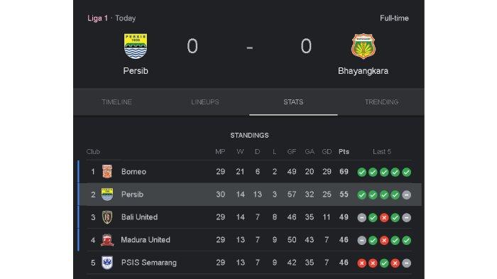 Maung Bandung pun tetap berada di peringkat kedua dengan koleksi 55 poin dari 30 pertandingan atau beselisih enam poin dari Bali United di urutan ketiga.
