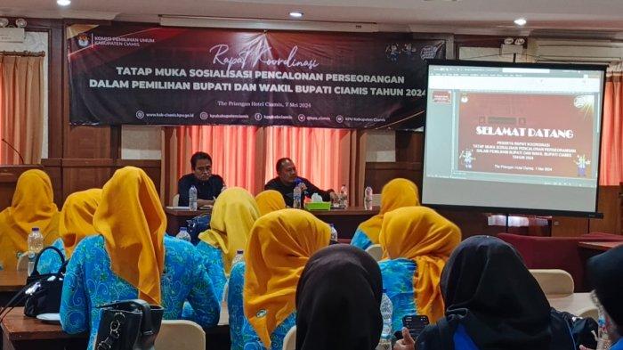 TRIBUNPRIANGAN.COM, CIAMIS - Hadapi Pilkada 2024, Komisi Pemilihan Umum (KPU) Kabupaten Ciamis menggelar sosialisasi dalam rangka pembukaan pendaftaran pencalonan Bupati dan Wakil Bupati melalui perseorangan, bertempat di Hotel Priangan Ciamis, Selasa (7/5/2024).