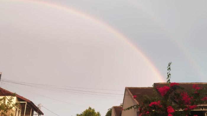 Pelangi atau bianglala hiasi langit Cianjur sore hari ini. Tidak hanya satu tapi ada dua pelangi yang dibentuk gerimis
