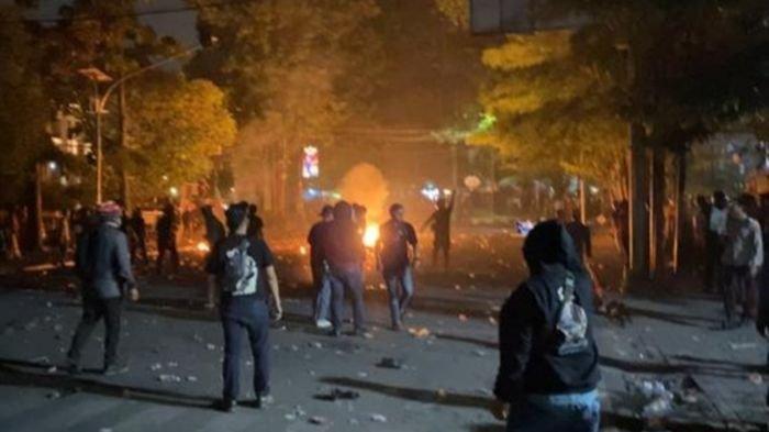 Selama aksi yang digelar sejak sore hari itu suasana di sekitar lokasi sudah mulai memanas karena massa terus membakar ban, menyalakan petasan