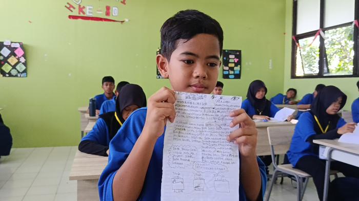 murid kelas 7 Sekolah Rakyat Cirebon bernama Alvindra Aulia Ramadan membuat surat untuk Wapres Gibran Rakabuming