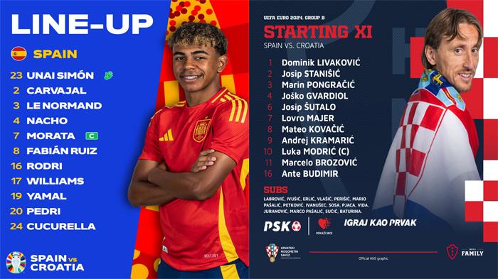 Susunan Pemain Spanyol vs Kroasia pada babak Grup B Euro 2024 digelar di Olympiastadion, Berlin, Jerman, Tim Matador turunkan Yamal pemain termuda